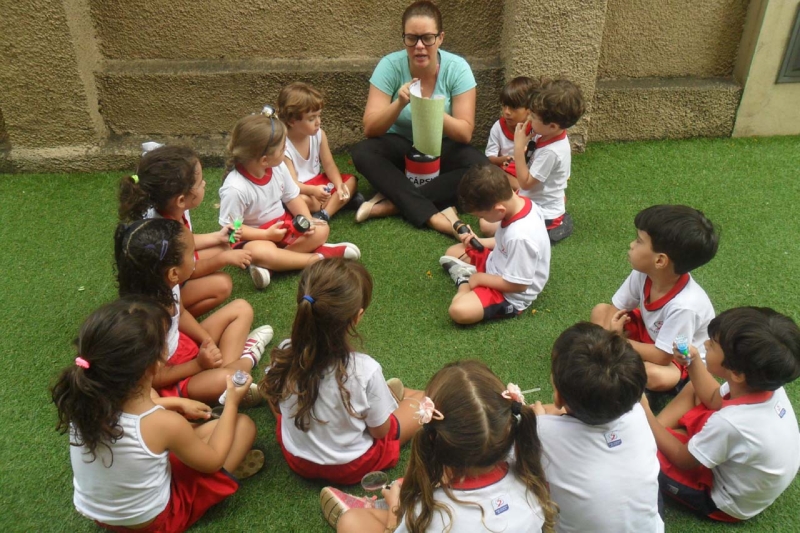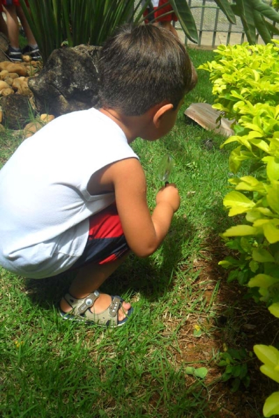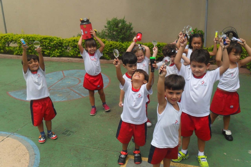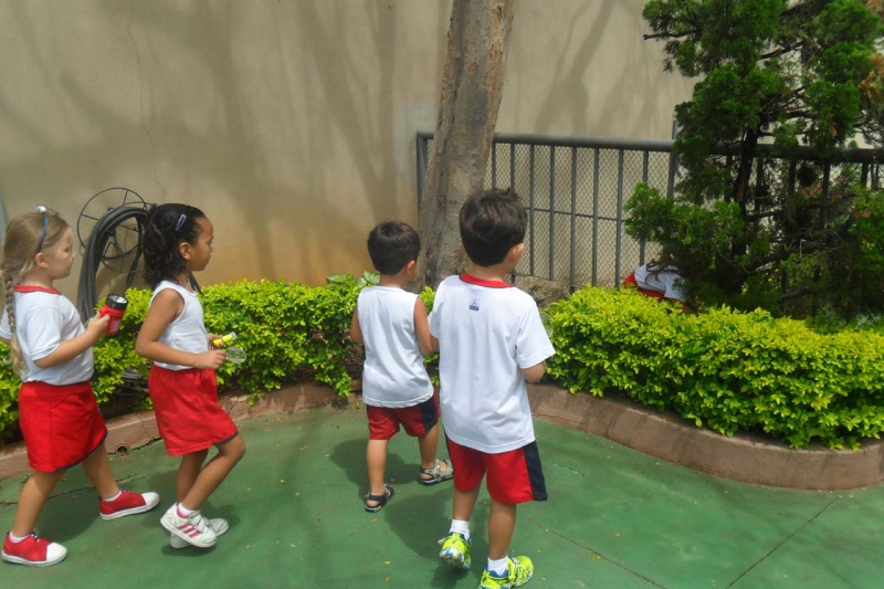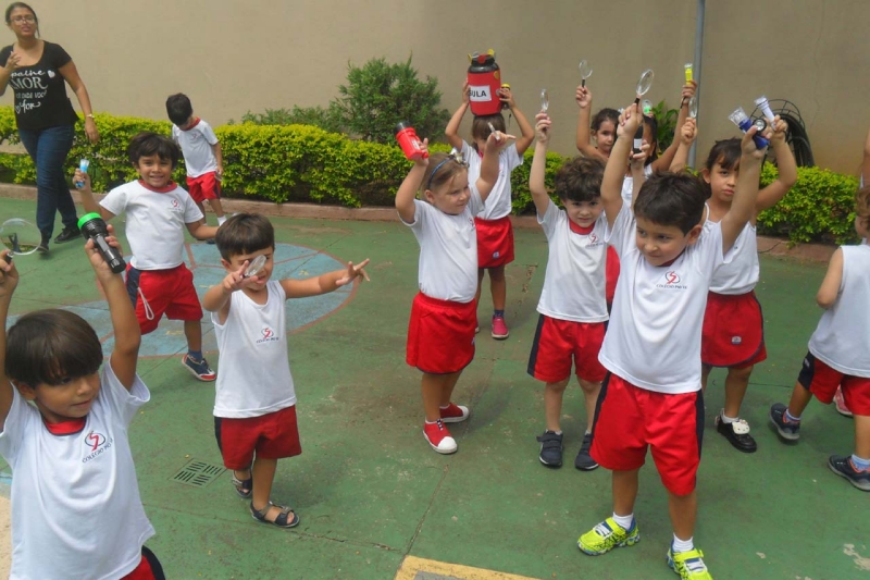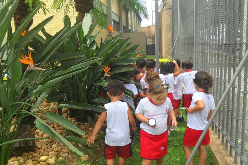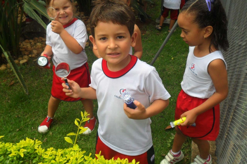 Com uma lupa e uma lanterna, os estudantes do Infantil II realizaram uma atividade inédita: encontraram no jardim do Colégio uma Cápsula do Tempo com cartas, músicas, estilos de roupas, fotos e recordações de Chiquinha Gonzaga.