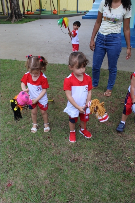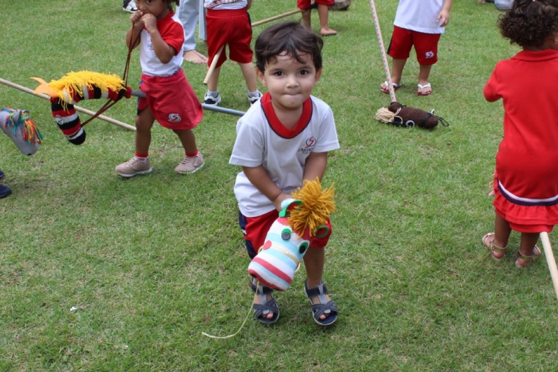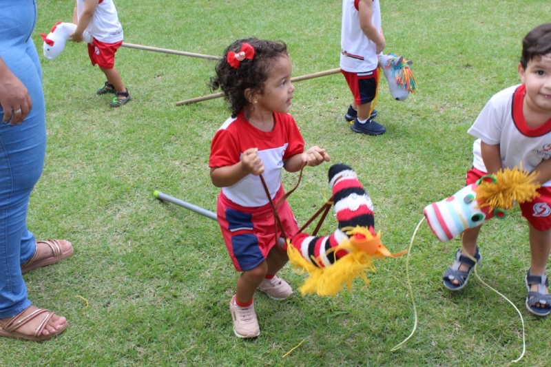 Muito além da brincadeira com o tradicional “cavalinho de pau”, o projeto possui uma intencionalidade pedagógica clara. Por meio das vivências, os alunos trabalharam habilidades importantes como equilíbrio, coordenação motora e socialização, além de ampliarem seus conhecimentos sobre o ambiente da fazenda e a diversidade dos animais.