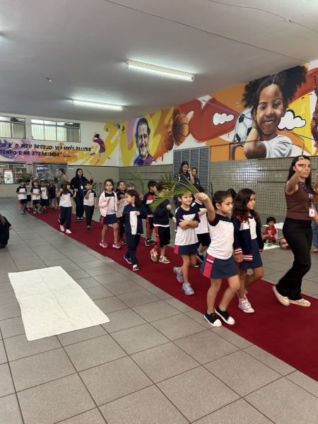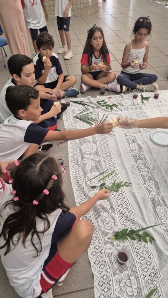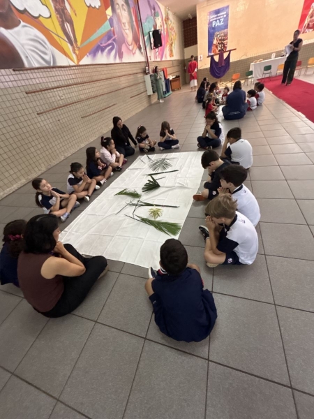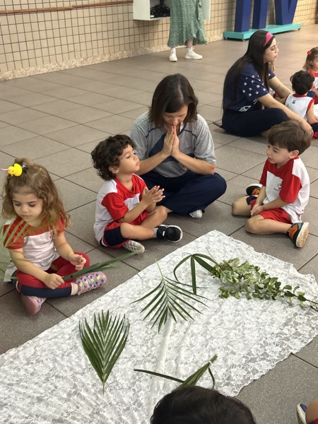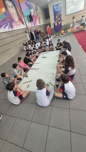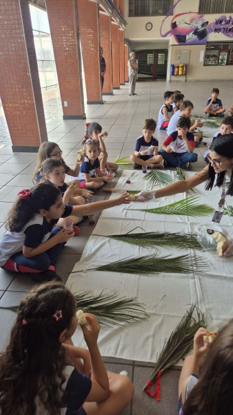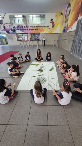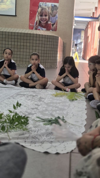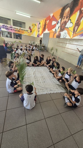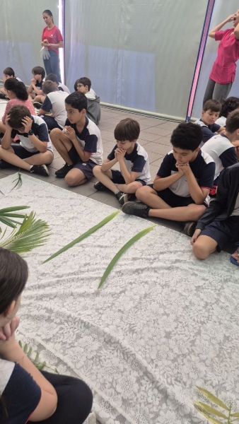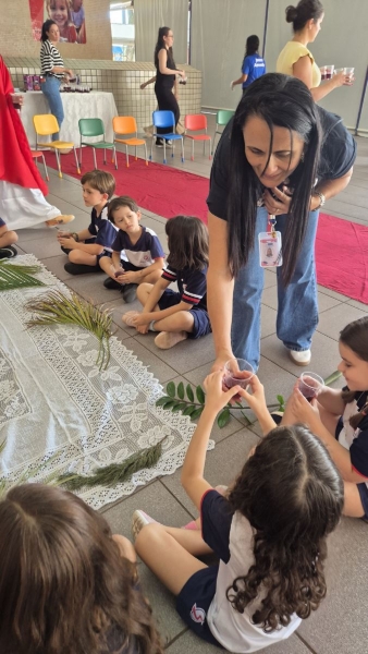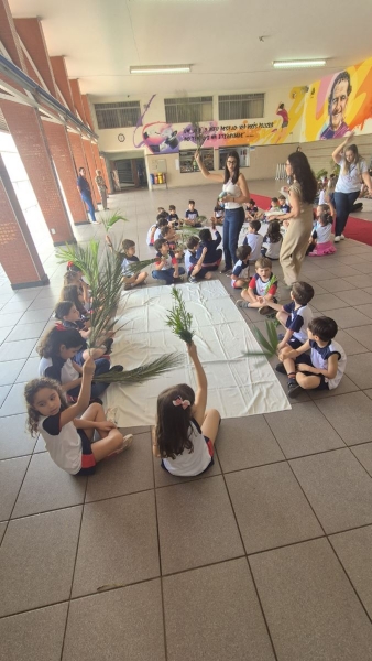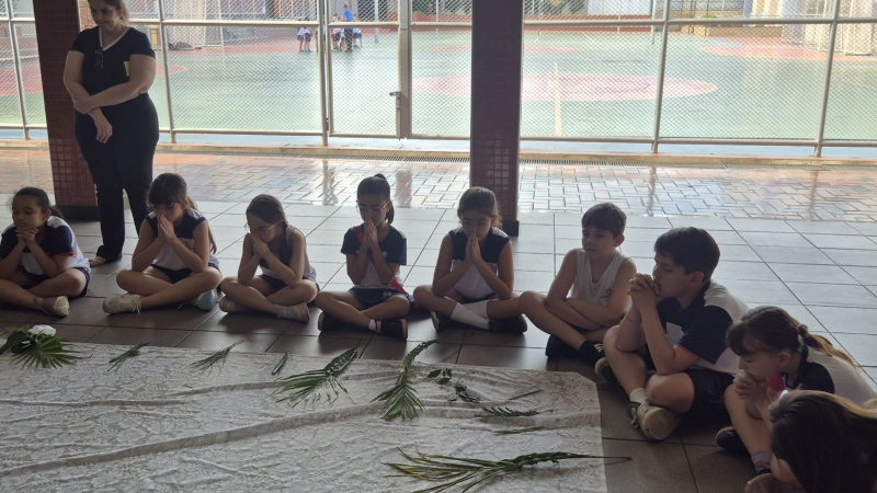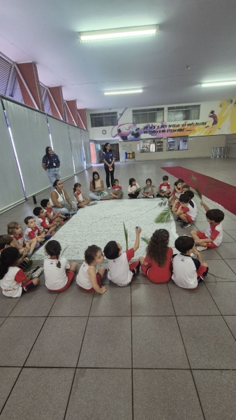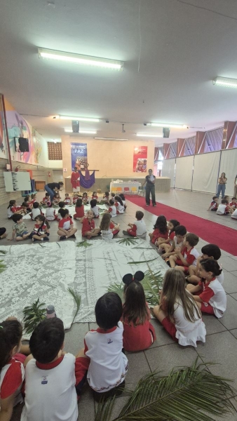 A programação teve início na segunda-feira (30), com encontros voltados à Educação Infantil e aos estudantes dos 1º anos. No período da manhã, as crianças participaram de uma vivência na área coberta da escola, marcada por momentos de oração, escuta e gestos simbólicos que ajudaram a apresentar, de maneira lúdica, o significado da Semana Santa.