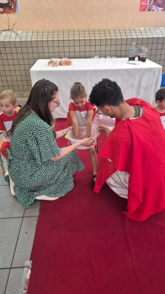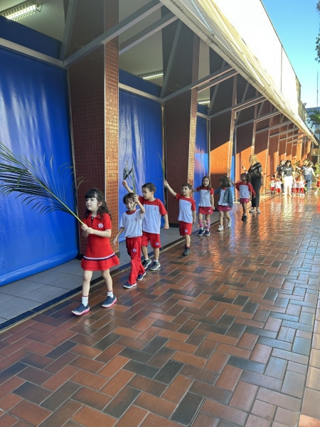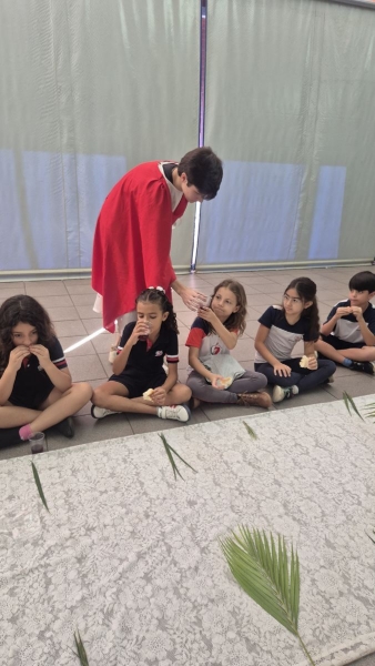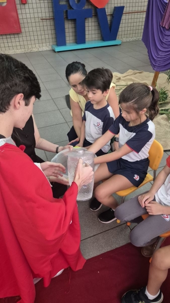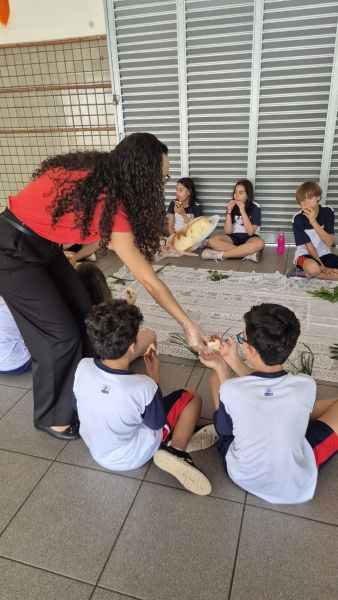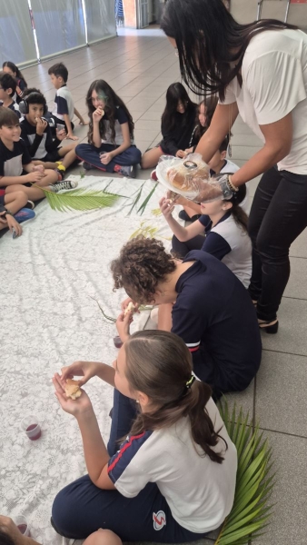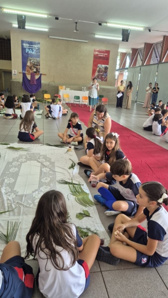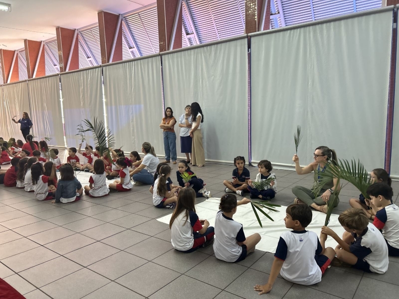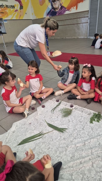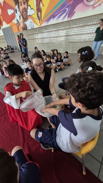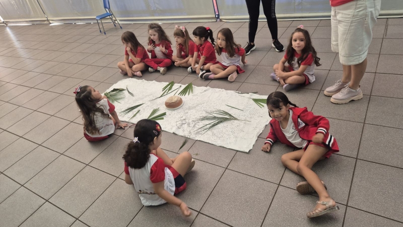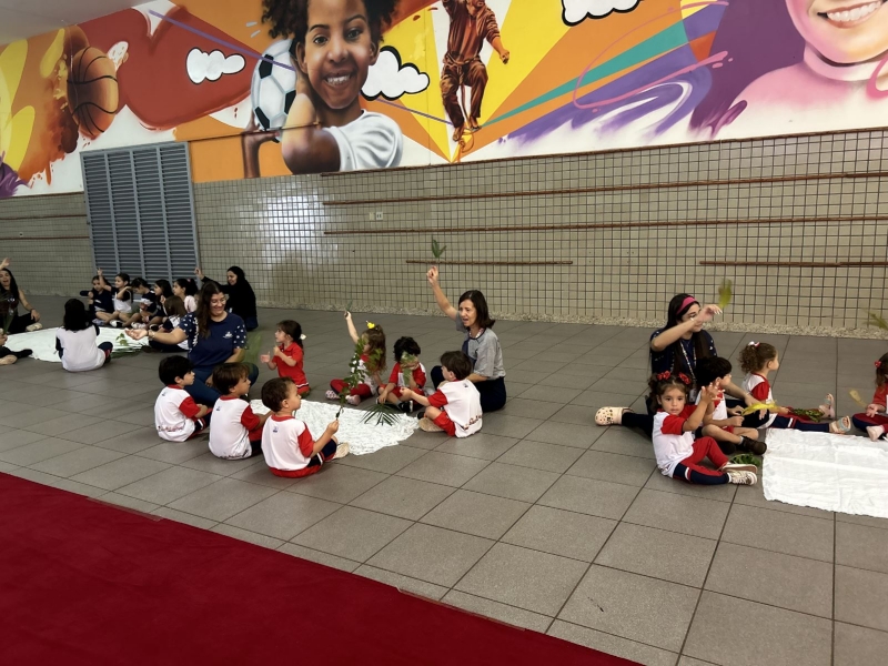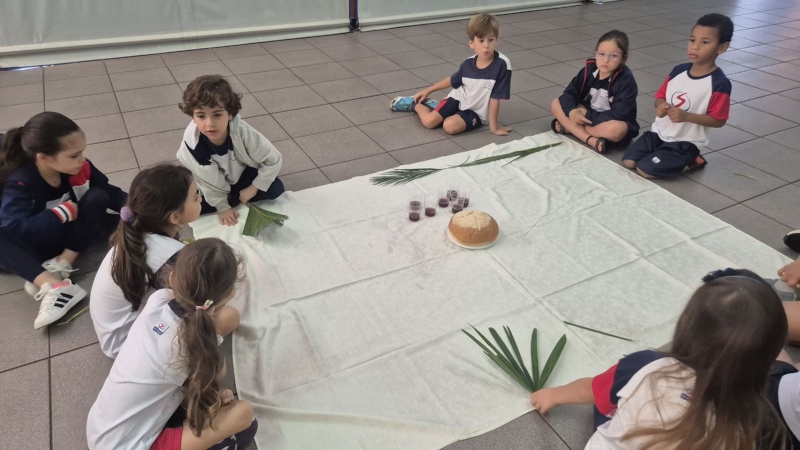 A programação teve início na segunda-feira (30), com encontros voltados à Educação Infantil e aos estudantes dos 1º anos. No período da manhã, as crianças participaram de uma vivência na área coberta da escola, marcada por momentos de oração, escuta e gestos simbólicos que ajudaram a apresentar, de maneira lúdica, o significado da Semana Santa.