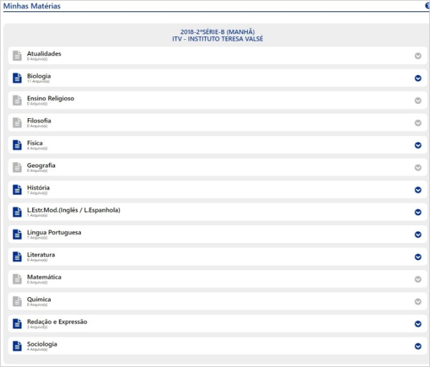 Minhas matérias – Tela destinada à exibição dos componentes curriculares e dos conteúdos inseridos pelo professor. Após clicar no aplicativo, será exibida a tela com a listagem dos componentes curriculares cursados pelo aluno e a indicação da quantidade de arquivos existentes. Quando não houver arquivo para o componente curricular, o ícone ficará cinza. Quando tiver arquivo disponível para o aluno, o ícone ficará azul.