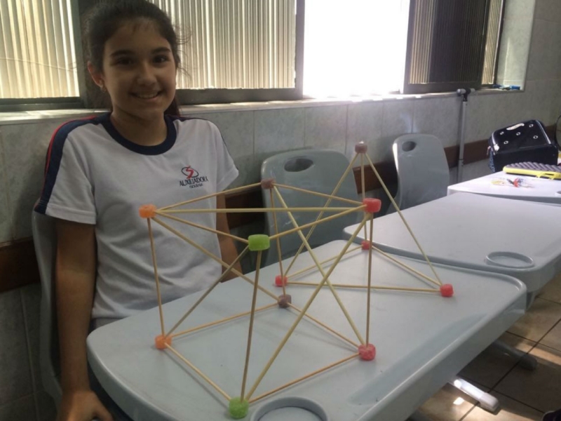 A Professora de Matemática do 6º ano, Sônia Vieira, utilizou atividades lúdicas, escolhendo a técnica com balas de jujuba e palitos de churrasco na construção de esqueletos de poliedros, de modo que as balas representam os vértices e palitos, as arestas. A construção de poliedros se torna fácil e rápida, facilitando seu uso na própria sala durante as aulas. Além disso, o material é de baixo custo e de fácil acesso.